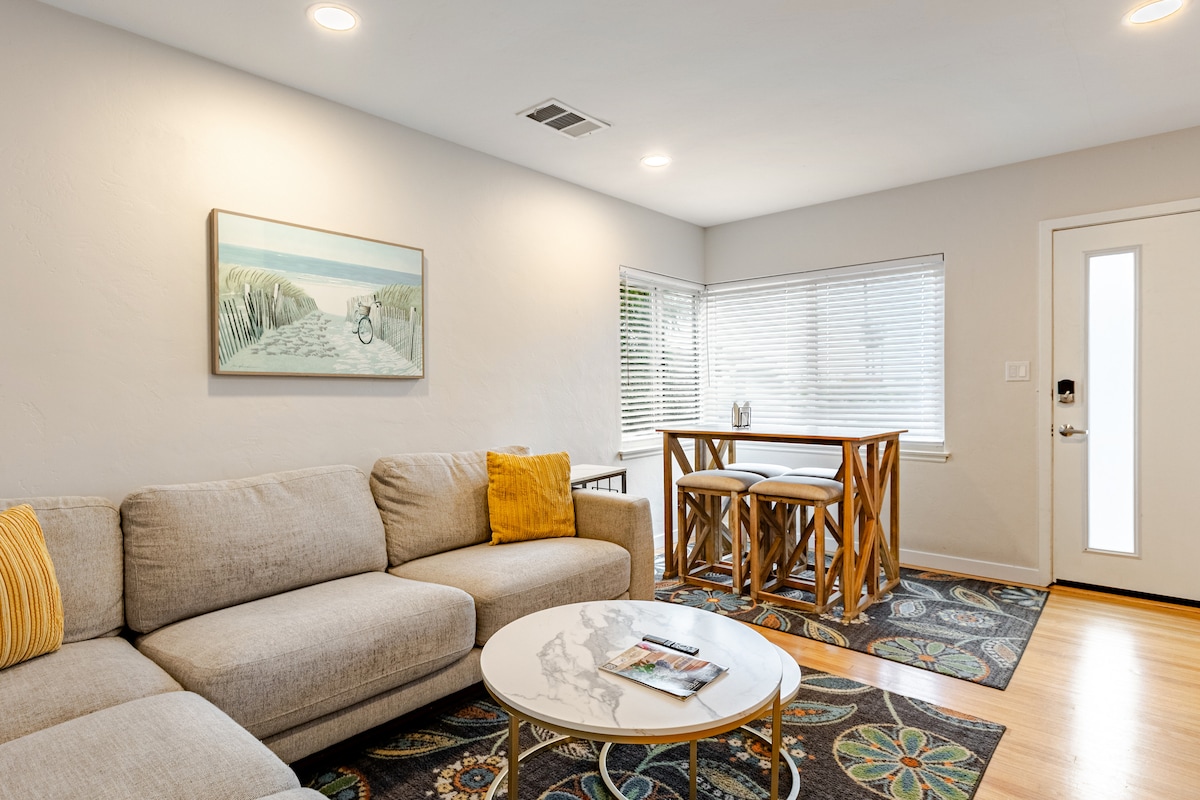 Relax in this completely remodeled, stylish, and comfortable one-bedroom upstairs unit just blocks from the beach, restaurants, and more. Enjoy modern finishes, cozy furnishings, and a bright open layout designed for unwinding. After a day by the ocean, come back to the smart TV, in-unit laundry, and air conditioning, plus a well-equipped kitchen that makes meals easy. The perfect home base for your beach getaway.