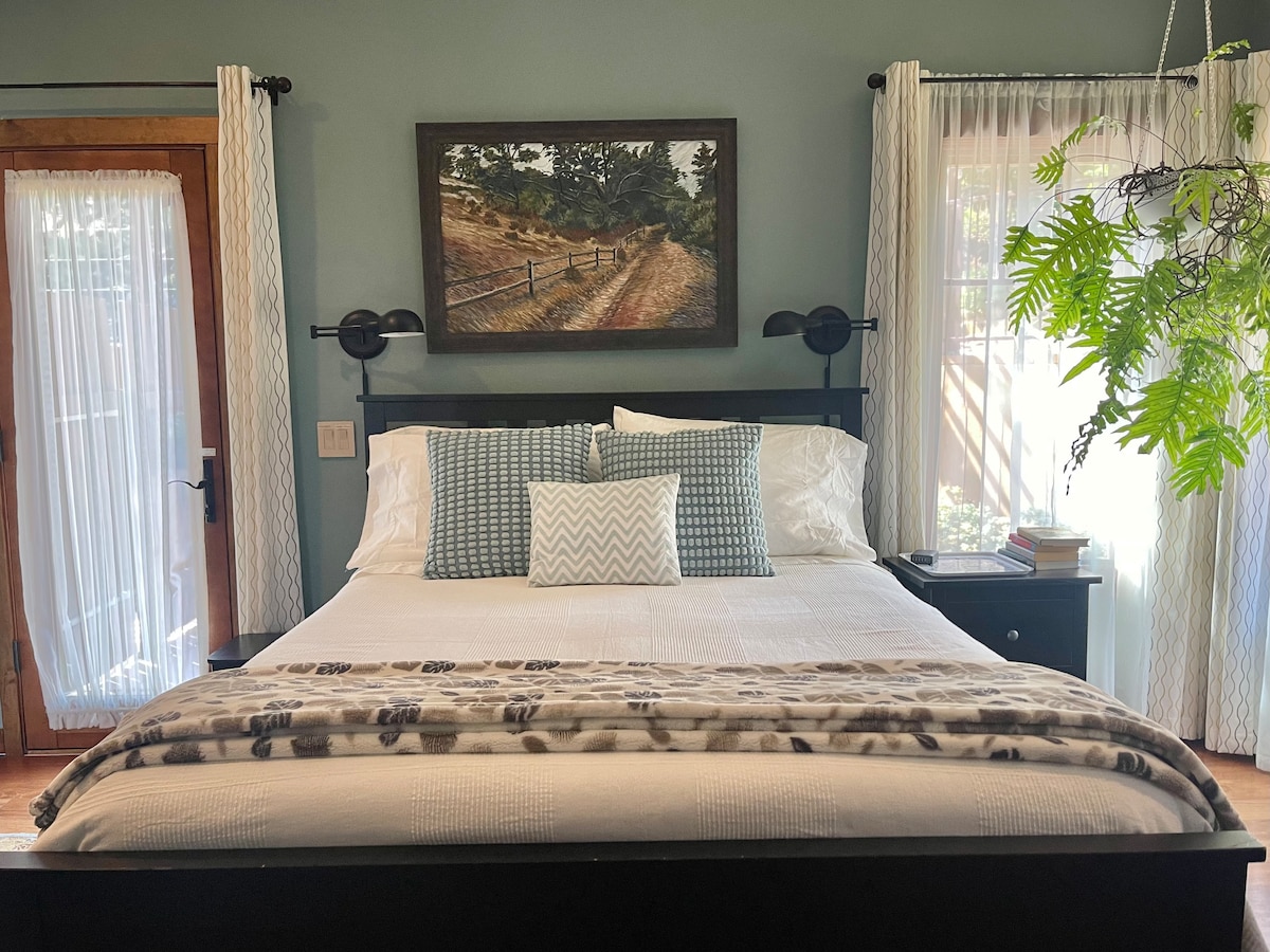 The cottage features full amenities that include: Tempurpedic™ queen-size bed. Wi-Fi, Smart TV, air conditioning, refrigerator, microwave, wet bar, coffee maker, toaster, and iron. Window seat for sitting, reading or lounging. Private entrance and patio connecting to a courtyard and Japanese garden. Spacious bathroom with 12 foot high tiled shower. French doors open to a private sitting area. If the days are booked in the cottage we might have an opening at, Mikes House and Garden.