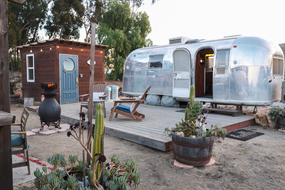 Discover a unique glamping escape in "Lucy and the Sky" our 24 ft Airstream trailer built in 1966. Named after the beloved sitcom, Lucy blends vintage charm with modern amenities. Relax in a private hot mineral bath, enjoy a cozy outdoor fireplace, and take in stunning panoramic views. Perfect for couples, solo travelers, or families seeking adventure, our serene Airstream offers peace, solitude, and a touch of magic. Experience the enchantment and tranquility of our California time capsule!!