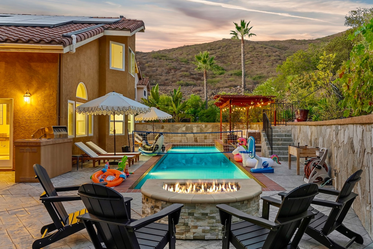 Experience Ultimate Privacy at Our Secluded 4-Acre Retreat in Vista. Escape to this hilltop sanctuary, where tranquility & stunning valley views await. Perfect for families, large groups, & retreat-style getaways, offering a rare blend of comfort & adventure. Unwind with an array of amenities with pool, hot tub, tennis court, volleyball court, basketball hoop, horseshoe pit, corn hole, pool table, darts & games. Gather around the large fire pit area for unforgettable evenings under the stars.