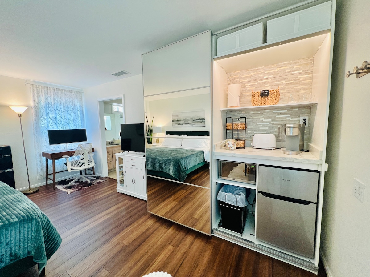 Modern, comfy studio in the heart of San Diego! Everything you need — full kitchen, laundry, workspace, balcony, & secure gated parking. Minutes from Downtown, Gaslamp, Petco Park, Balboa Park & Golf Course, San Diego Zoo, Convention Center, & Little Italy. Quick freeway access makes it easy to reach beaches & all San Diego attractions. Walk to parks, grocery stores, coffee, local breweries, amazing Mexican food, Luigi Pizza, & the historic Turf Club. Perfect home base for exploring San Diego!