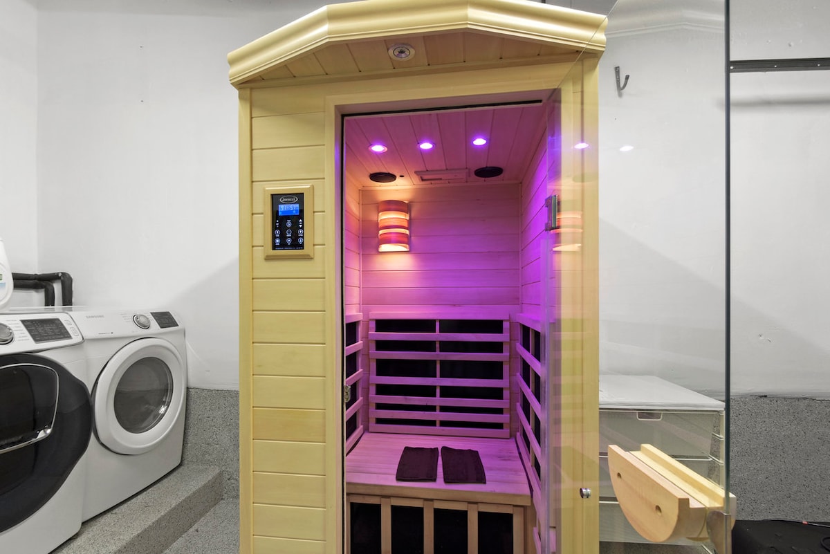Soothe your senses and unwind in your private spa retreat, featuring a restorative sauna, a huge soaking tub, and the refreshing scent of eucalyptus aromatherapy. Sink into a luxuriously comfortable king bed, surrounded by a calming ambiance. Thoughtful touches like plush robes and a chilled filtered water dispenser elevate your experience. Set in a tranquil neighborhood with easy access to San Diego’s highlights, this sanctuary offers the perfect blend of relaxation, rejuvenation, and comfort.