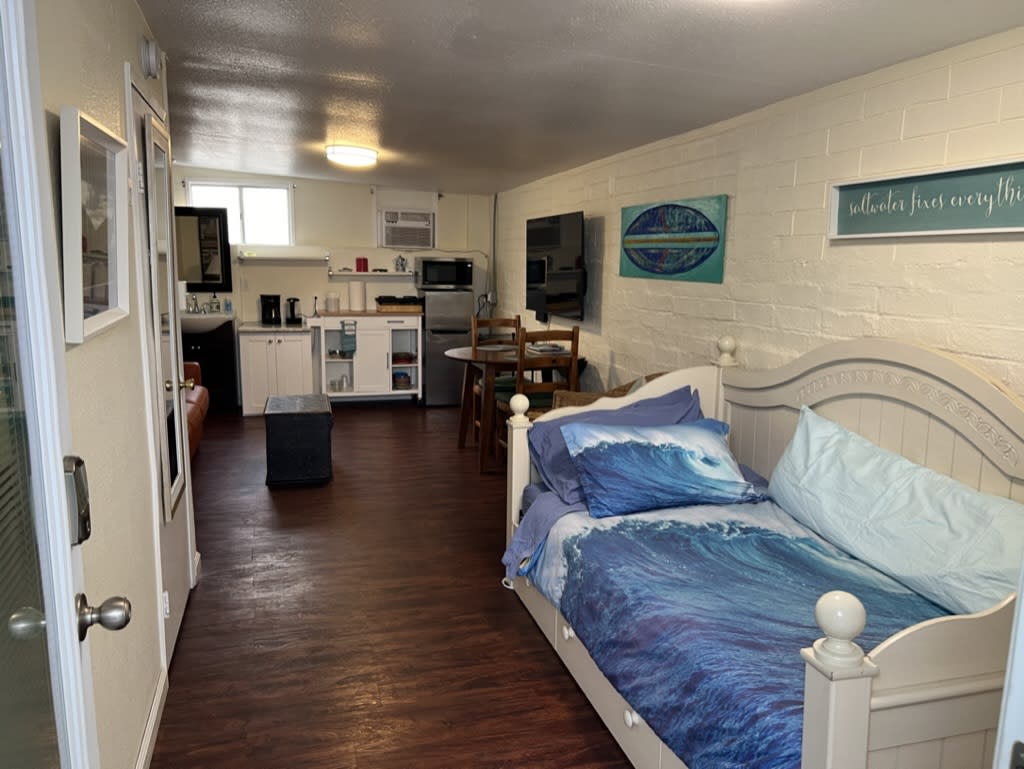 1/1 Classic Beach House, 1 PARKING SPOT, a half block from the beach. This home has character with a fresh look, upgrades. Restaurants, Bars, and Shopping with in walking. One parking space in driveway. Sit in the front yard, you can be a part of beach life or watch it happen. We just added motion lights and a full Tonal home gym. This is a fun place to stay. We live here part-time and Love it! Copy of ID is required before check in.
