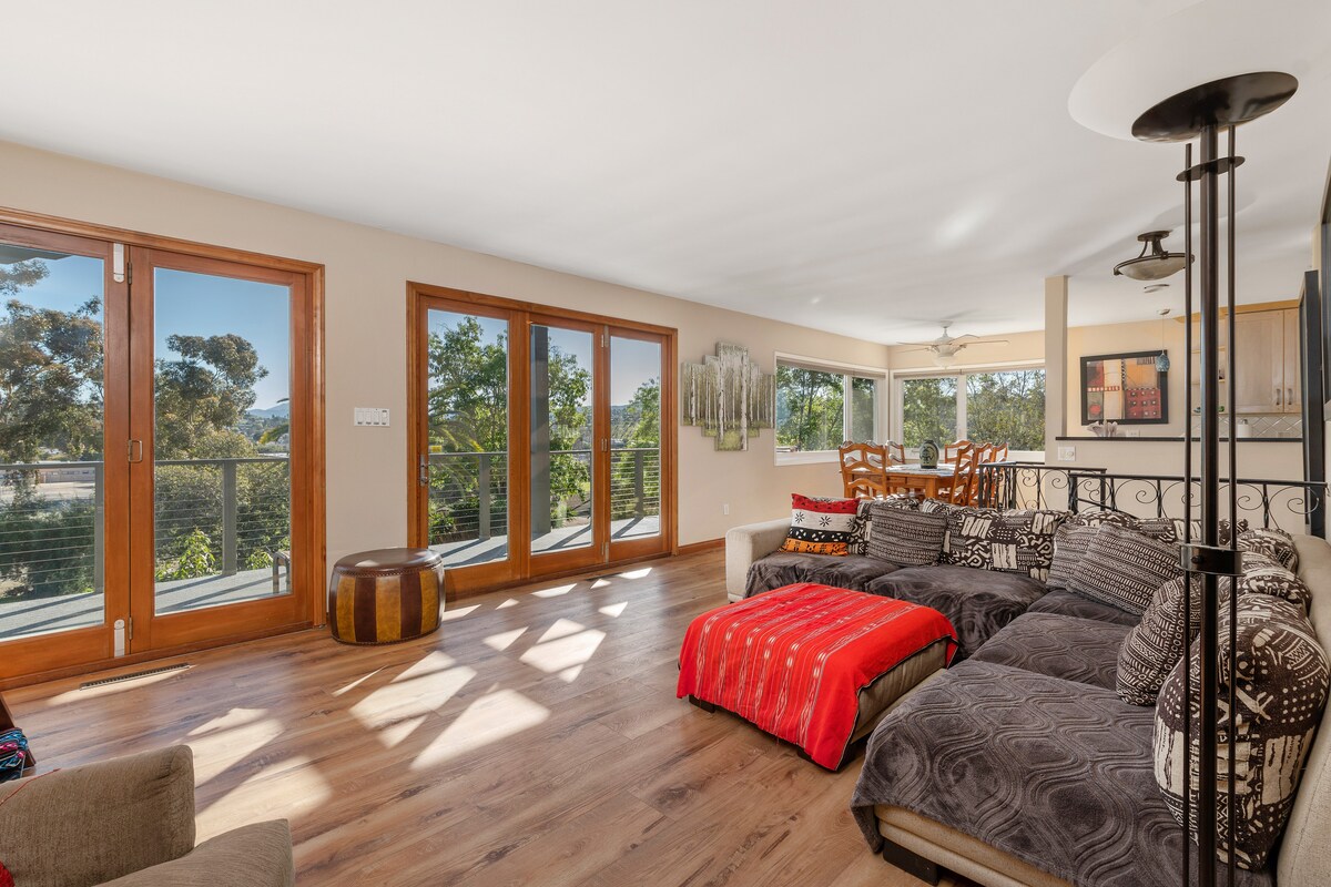 Spacious & Sunny 3+/2 split-level,family home with mountain views. Remodeled kitchen & baths, open floor plan. 4 Queen beds plus a double convertible futon sofabed. Upstairs view Deck, Firepit, ping pong table. 15 min to downtown, Zoo, Balboa Pk, etc. Coffee, washer/dryer, WIFI. Fully stocked kitchen...everything you need! Air conditioning, large bi-fold doors open to deck...perfect for temp housing, family gatherings or your small business retreat! Message if ANY questions! NO SMOKING/VAPING