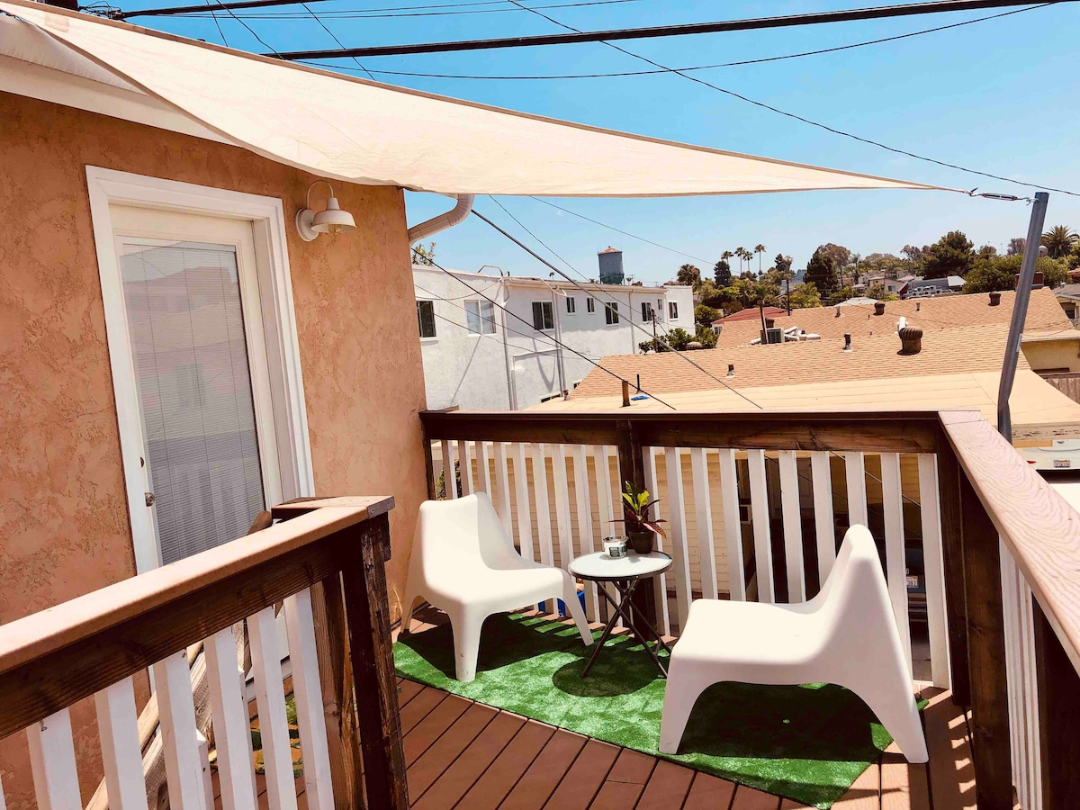 *CHECK OUT OUR OTHER AIRBNB* Travel 16 steps up a Greek-inspired curving stairway with 2-story high walls to your tucked-away cottage built into the hillside villa of Alta Colina. With spectacular views, step onto the balcony to watch planes take off & boats sail around the harbor. End the night in front of your secluded back patio fireplace or climb the steps of your spiral staircase to the rooftop Jacuzzi. European-inspired design & details, it'll be hard to believe you’re still in San Diego!