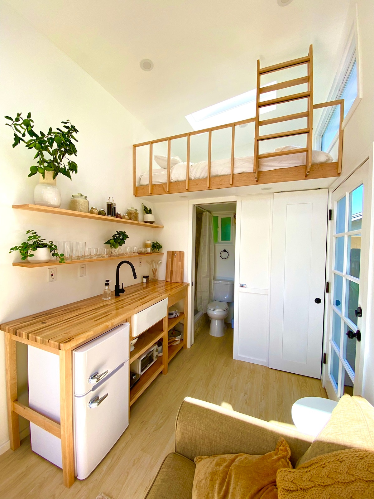 The Overlook sits perched above an untouched valley that stretches into textured hills and horizon beyond. Here, your tiny house awaits. Open the double doors and find all you need. A cantilevered bed above couch, 10’ kitchen counter, bathroom with fully tiled rain-shower and composting toilet, dining/work nook, and outdoor barbecue/seating area. Come step away. Reconnect. Cook. Read. Write. Lounge. Think. Come discover a slightly different way of doing things. Welcome to The Overlook.