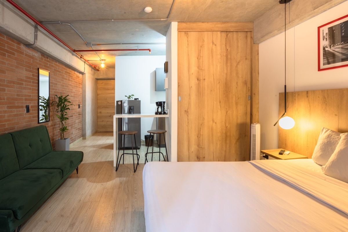 Suite completamente amoblada de 28 m2, con aire acondicionado y cocineta. Ubicada en una de las mejores zonas de Medellín, en un barrio muy tranquilo y cerca de todos los sitos de interés. La Suite cuenta con una vista espectacular a la ciudad y a las montañas. Podrás hacer uso de la zona de coworking, gimnasio y un espectacular café que ofrece diferentes tipos de bebidas a base del mejor café colombiano, podrás disfrutar de tu bebida en la terraza que se encuentran en el 2do piso del edificio.