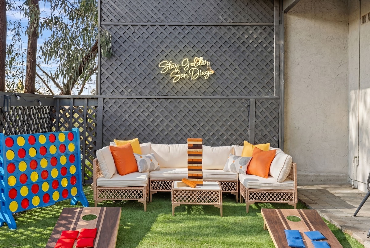 Enjoy a stylish experience at this centrally-located bungalow. Just a short walk to La Mesa Village, where you can enjoy restaurants, coffee shops, boutiques, & more. The outdoor space has a hot tub, fire pit, yard games, & bbq. Hop on the trolley to get anywhere. Traveling with additional friends and family? We have the Casita de Pueblo located at the same location. Check it out under our other listings where you can book both. 20 min drive to the Beach, Downtown, Balboa Park, or Old Town