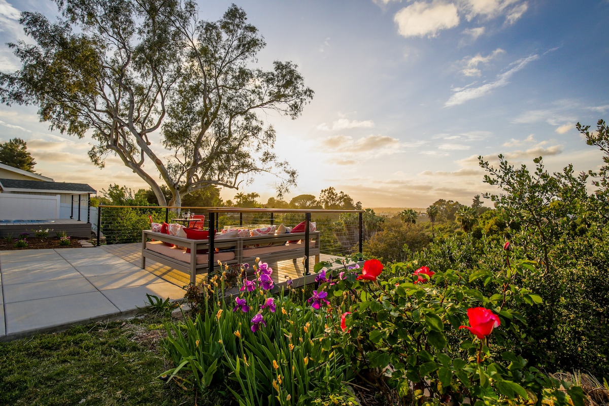 *CHECK OUT OUR OTHER AIRBNB* Travel 16 steps up a Greek-inspired curving stairway with 2-story high walls to your tucked-away cottage built into the hillside villa of Alta Colina. With spectacular views, step onto the balcony to watch planes take off & boats sail around the harbor. End the night in front of your secluded back patio fireplace or climb the steps of your spiral staircase to the rooftop Jacuzzi. European-inspired design & details, it'll be hard to believe you’re still in San Diego!