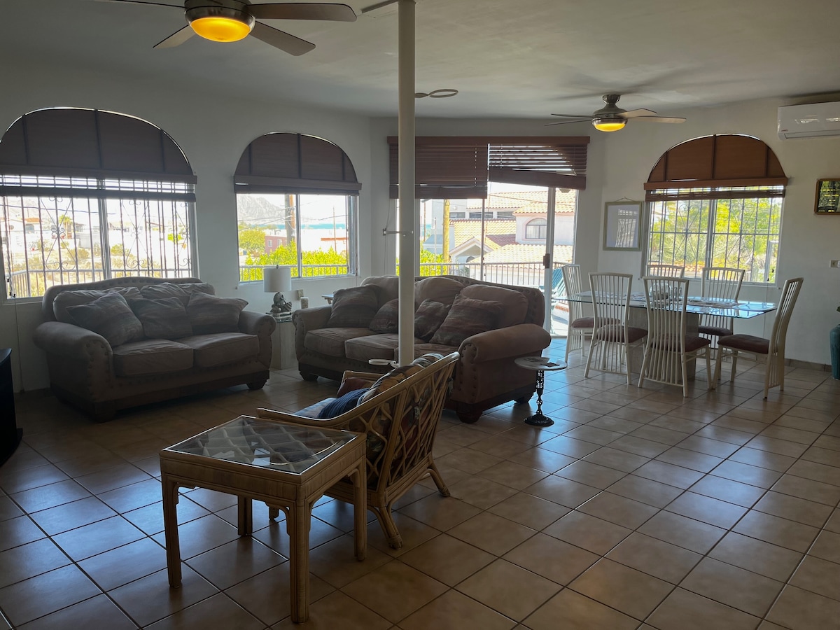 Beautiful oceanview spacious modern home! Space for the whole family, just steps from the beach. All the comforts of a cozy home with amazing views of the Sea of Cortez. The home is rented with the first 2 floors, inc. 3 bedrooms (Bed#1 Queen Bed+Toddler bed w/priv. bth - Bed#2 Queen Bed+Bunk (Full/Twin) and Crib+Bth in hallway) (Bedroom#3 in 2nd floor, inc. Queen Bed and Twin Jeep Bed and Sofa Sleeper+bath in hallway) 3rd Floor (2bd/2ba sleeps 8) is optional additional nightly fee applies.