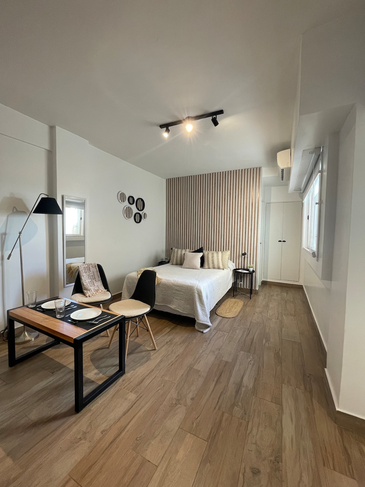 Super practical with good sunlight all day. Downtown (50 meters from the train station and 300 meters from the main avenue with more than 10 bus options). PRIVATE PARKING INCLUDED. 1 bedroom with double bed, full bathroom. Full amenities: Air conditioning in both rooms, TV with Chromecast, Wi-Fi, Washing machine, Microwave, Toaster, Coffee maker and Iron. Fully equipped kitchen elements and tableware.