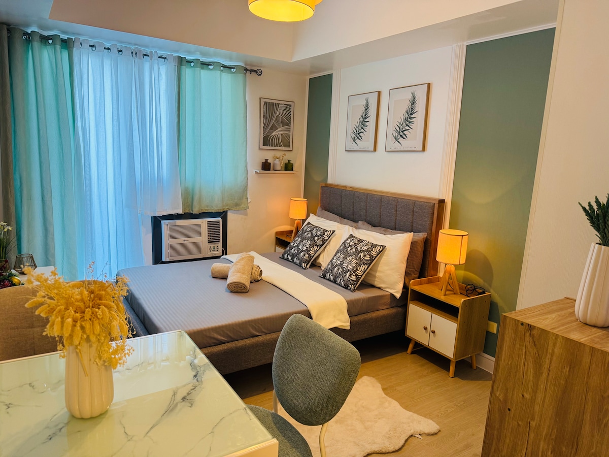 Experience a relaxing stay in this big, spacious and stylish 1-bedroom unit at Kandi Palace ( 8th floor ). Complete kitchen utensils Upgraded Big 2 TV Refrigerator Microwave oven Big Sofa Office table and chair Dining table and chairs Balcony table and chairs Cable, stream tv Fast WIFI White and blue lights Shower heater Water heater Fully Furnished Free Parking Area Rooftop access: Swimming pool Restaurant Closer to the action yet still quiet, perfect to relax 🌸