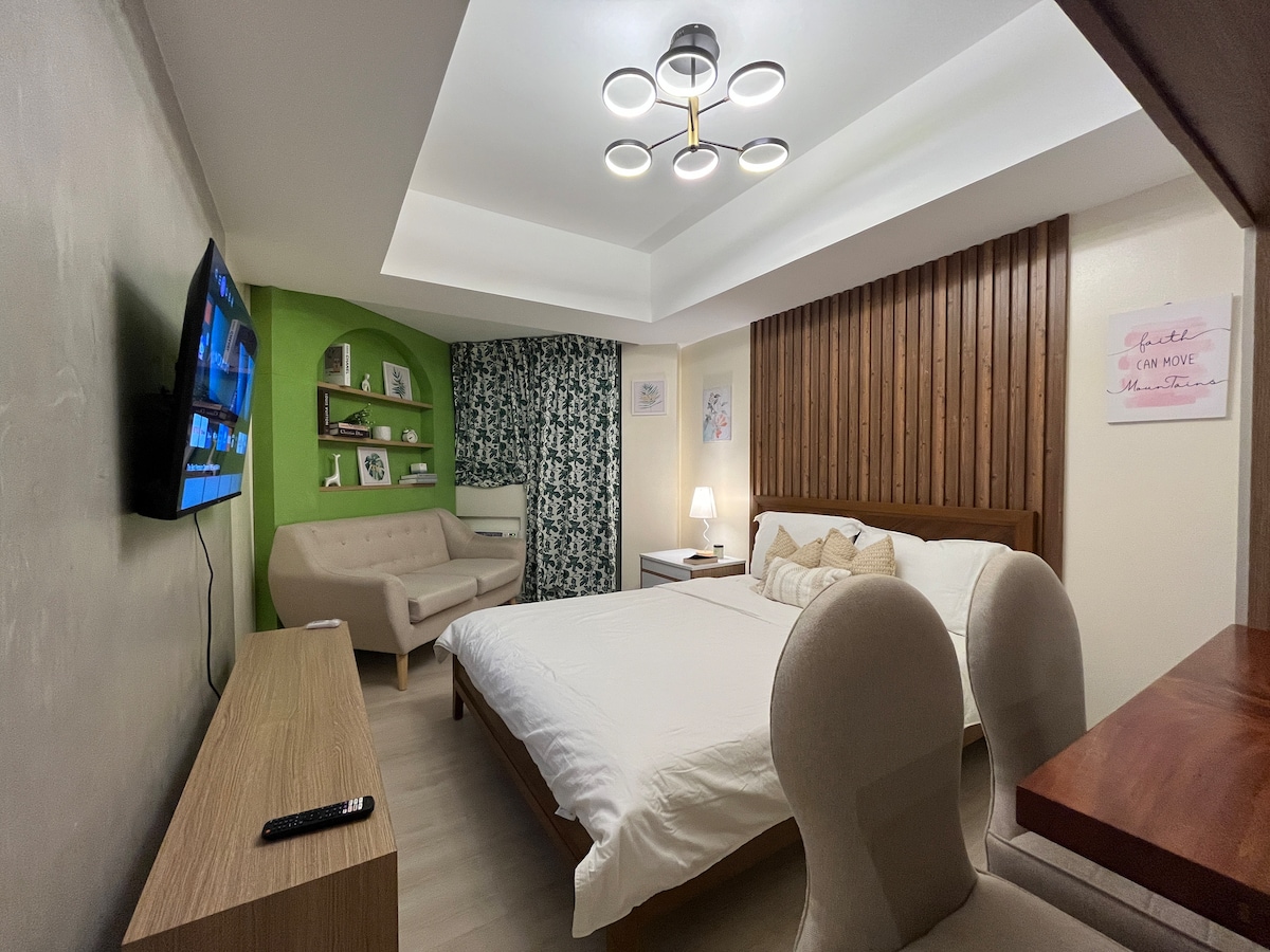 Angelic Premier Residences is close enough to SM, Korea town, restaurants & bars, but far enough that it's not too noisy. The building has gym, 24-hour rooftop pool, and a sports bar with a billiards table. There is common parking in front of the condo on a 1st come 1st serve basis + additional parking lot across the street. This is a fully-fitted 1-bedroom apartment with easy check-in, 2 x Netflix TVs, 200Mbps Fibre Optic Internet, 1 x King-size bed, one fold-up single bed and a comfy couch!
