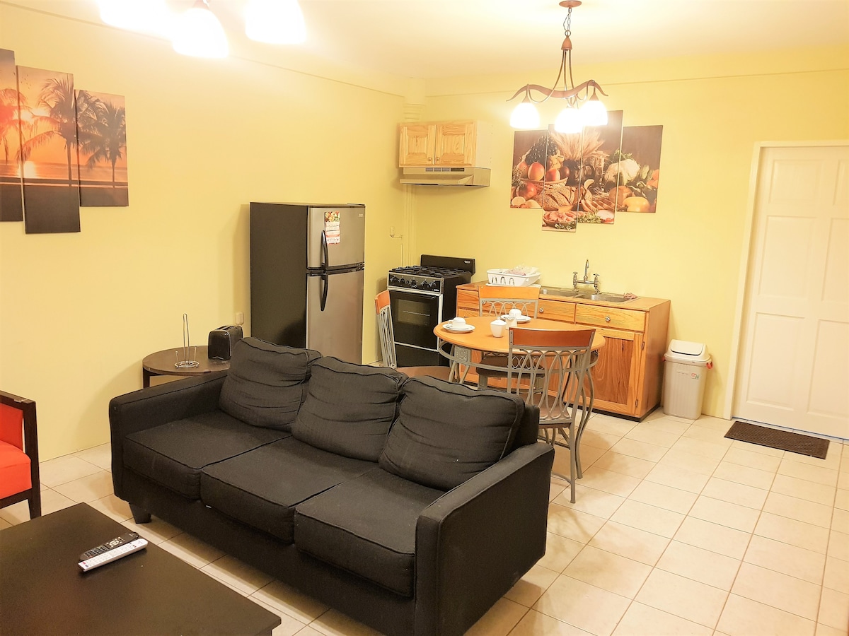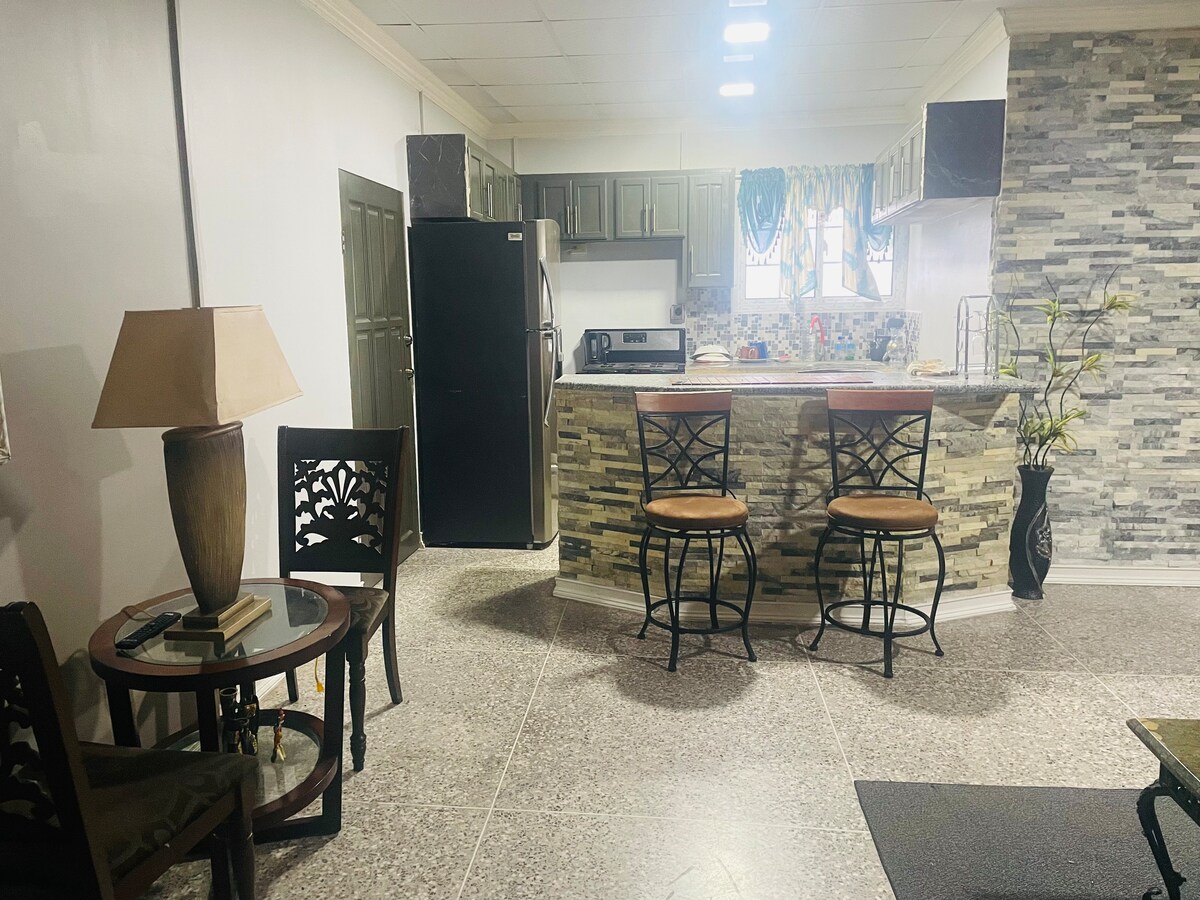 Take it easy at this unique and tranquil getaway.This special place is in a safe neighborhood and securely located on a gated compound . With a Centralized location it guarantees the opportunity to explore the central and southern parts of the island while still being reasonably close to the capital and airport. Peace of Mind is a necessity and this modern day tucked away apartment will certainly offer that Serenity that you and your group deserve.