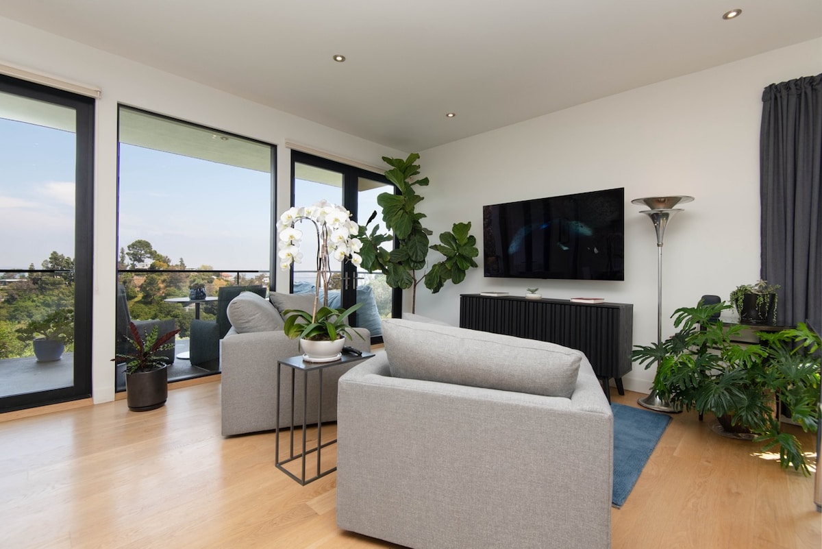 Midcentury modern 2bed/2bath stilt home with spectacular views above Sunset Strip (2 blocks up from Hollywood + Fairfax). Only blocks from the action, but very private and quiet. Recent renovations from roof to foundation, heat/AC system, 1 Giga/sec wifi, wired in + out with 11 speakers, movie projector + two 4k TVs (free Netflix, HBOMax and AppleTV+), 2-car parking with level 2 electric charger. Please note: No social gatherings or late, loud nights. Interior = 1015 sq ft. Deck = 300 sq ft.