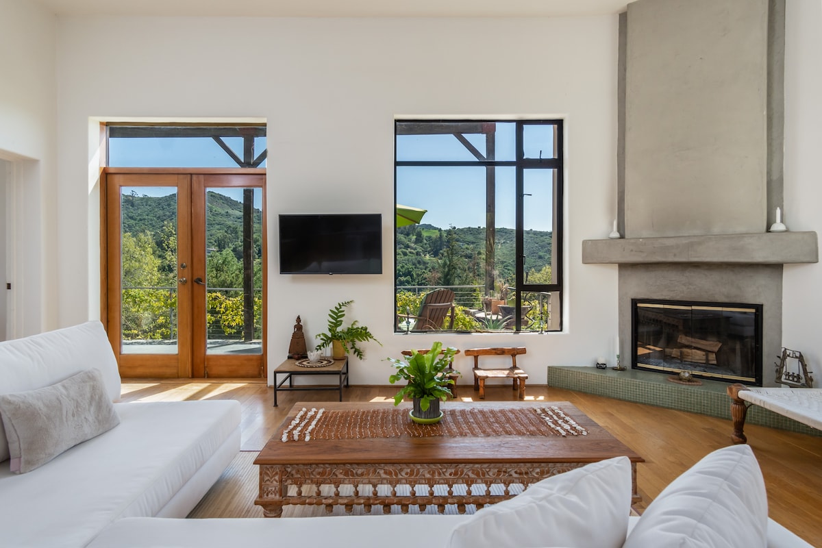 The house sits beautifully in the canyon, its organic feel and yet modern design transcends the idea of California living by blending indoor/outdoor through massive windows, incredible ceiling heights and stunning views. Nestled in the canyon, but only 5 min from Topanga town with its shops and restaurants and 10 min from the beach. You can now enjoy our new cedar wooden hot tub after a relaxing yoga session in the studio. Featured in the NYTimes, Dwell, Vogue...