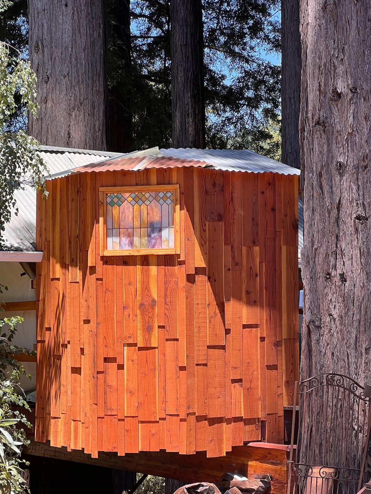 A Magical Glamping Retreat in the Redwoods Escape to a dreamy Tree Fort tucked among redwoods, where rustic charm meets modern comfort. Fall asleep to crickets and a bubbling creek, then wake to birdsong and fresh mountain air. Designed for couples and solo travelers seeking a romantic, peaceful escape. Relax in the hammock or gather around the fire pit with forest views. Enjoy hassle-free glamping with electricity, a cozy bed, a private bathroom with hot water, and a kitchenette. VRP#181501