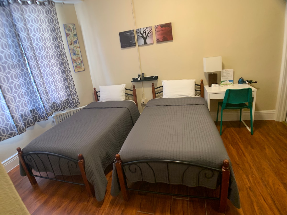 This spacious, ADA accessible room features a full bed, a twin bed, and a twin-over-twin bunk—ideal for families or groups of friends traveling together. You’ll have exclusive access to this room (not shared with other guests), along with a shared 1.5-bathroom setup and a cozy living room that overlooks our peaceful rose garden. All bed linens and towels are provided. Guests also have full access to our ADA accessible communal kitchen, free WiFi and welcoming hostel common areas.