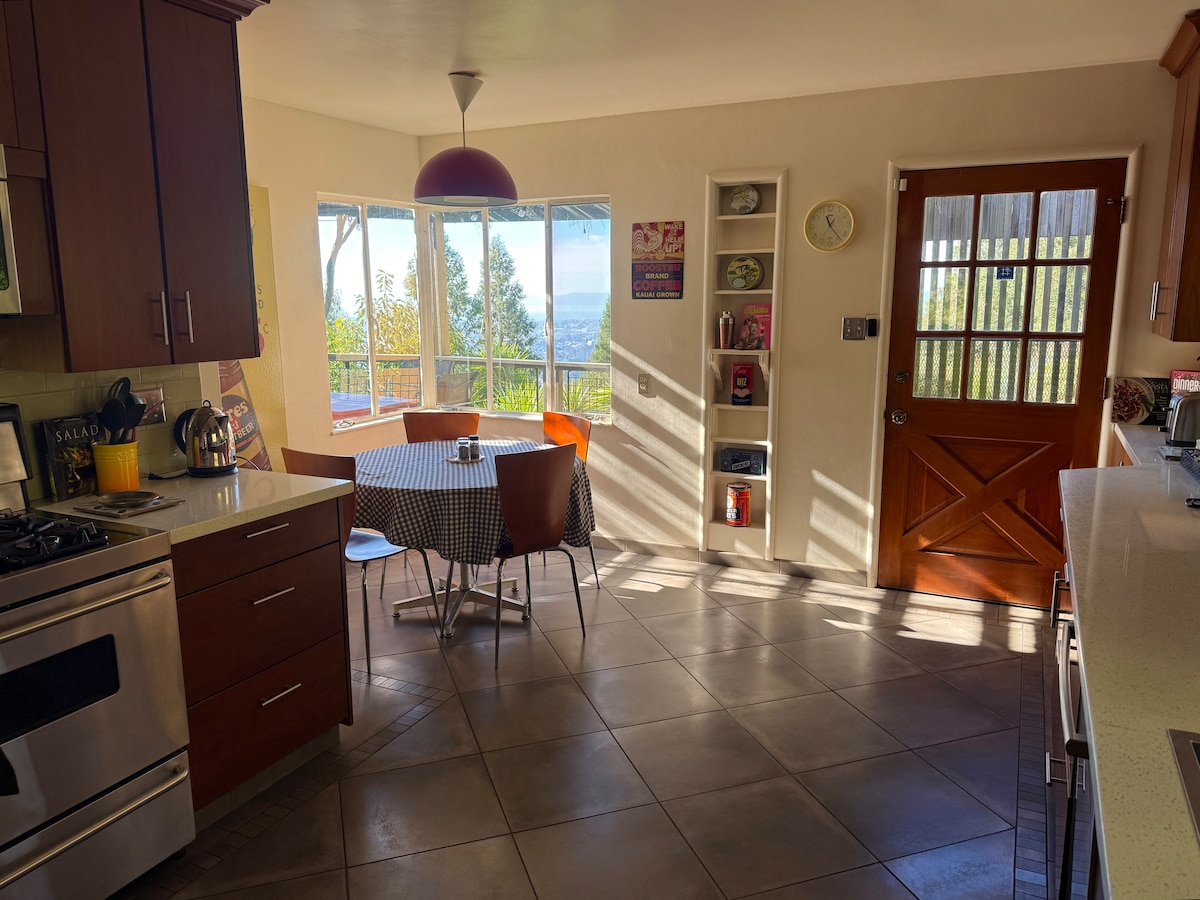 Spanish-style home in the Oakland hills , a quiet neighborhood Spacious, open layout with fantastic views of the San Francisco Bay Area. Great location: Close to Montclair village and quick access to San Francisco. Half-mile walk to the best open space parks in the east bay: Joaquin Miller Park! Features one acre of attractive gardens, patios, and a large deck with bay views. Great for family reunions, get-togethers or larger families. Plenty of parking, 4 cars+, in huge private driveway