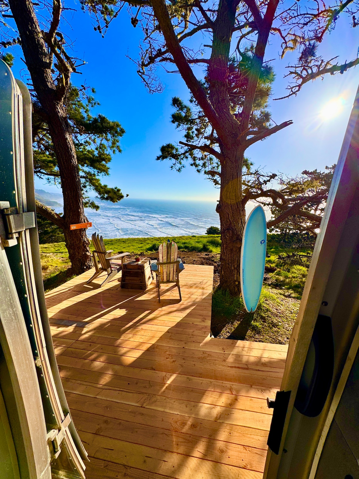 On 9 private acres overlooking the stunning Beach and Ocean from a breathtaking cliff top view. Stunning sunsets. Famous surf views with large windows. Fully loaded with all the amenities to make your glamping experience perfect. Fire pit, outside BBQ, outside griddle, Heat, A/C and fully stocked kitchen. Full bathroom with shower. Within 10 mins of Half Moon Bay shopping. Beach access short walk or drive. If this one is booked, there are three other equally similar Airstreams on the property.