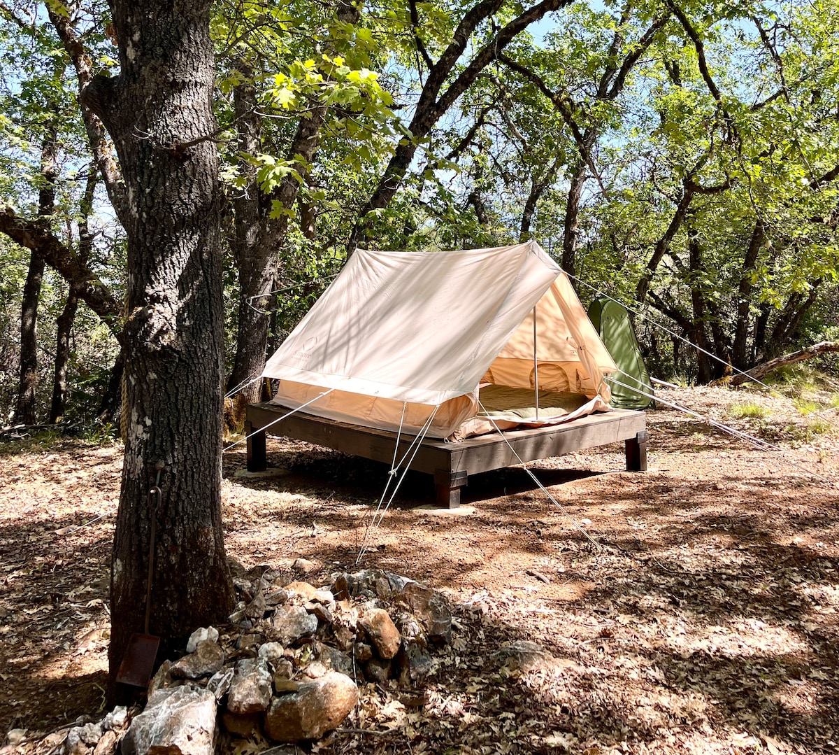 No trash service! Pack out your trash! No campfire, drug/marijuana, loud noise allowed, quiet hour 10p Large 200sf tent in the prime location, very close to the shared bathroom (hot water) Max 4 person (2 queen beds), 1 car No shoes allowed inside tent Picnic table No electricity in tent No lock You can rent heater and propane tank Sink in utility shed with drinking water 45 acre forest, hiking trails, creeks, waterfall, deer, turkey, owl 20 min to Los Gatos downtown, 25 min to Santa Cruz