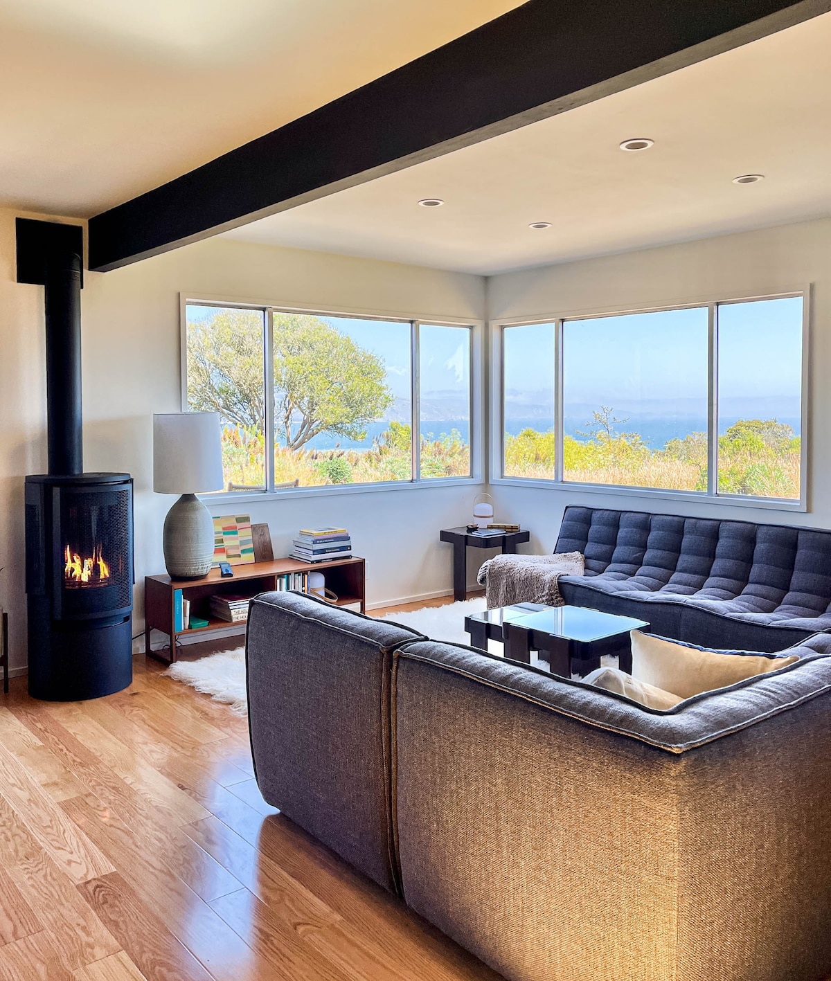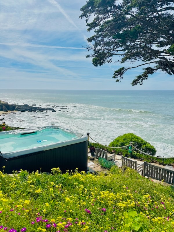 A blissful coastal retreat with unparalled ocean views, the Ocean Parkway House is nestled on a secluded bluff over looking the Pacific. This unique 1960's Bolinas beach house is a spot to truly relax and unwind. Fully updated with a curated mix of vintage and modern furnishings - our cottage has a mid-century design sensibility with luxuries like Coyuchi towels, a chef's kitchen, Scandinavian fireplace, outdoor rain shower, cedar hot tub, and new heated stone loveseat on the upstairs deck.