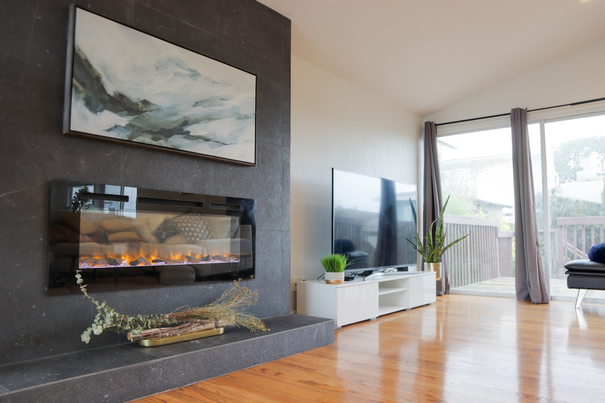 Perfect for biz travelers to San Francisco, company retreats, off-site meetings, or family vacation! • stunning ocean view. Sunset • free parking • 15 min SFO, 10 mi. SF, 20 mi. Half Moon Bay • 1 mi. surf at Pacifica State Beach,Pacifica Beach Park, hiking trails • 2.6 mi. Pacifica Pier • 3.6 mi. Mori Point • sweeping hillside views thru-out/w ocean views • full kitchen, washer/dryer, tv/wifi • beaches dotted/w quaint shops/restaurants • privacy & fresh coastal air • Uber is easy and convenient