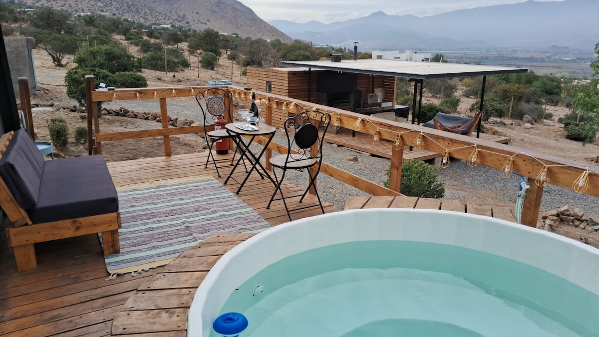 Un Refugio único privado, con la mejor vista a la Cordillera de Los Andes. Es un lugar exclusivo, sin casas cercanas, no es un camping. Estás cerca del Casino Enjoy (20 minutos), Centro de Sky Portillo (60 minutos) y Santiago ( 1 hora). El lugar cuenta con Hot Tub y piscina para nadar por separado , gran quincho con una maravillosa vista. Primer piso con salida directo a la Tinaja, para personas con movilidad reducida , conecta con el silencio y la tierra, Sustentable... Full equipada.