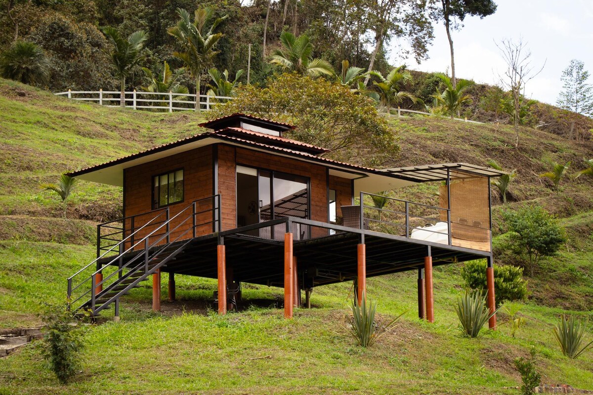 Elevated cabin constructed entirely from wood with excellent design, designed for a couple. It boasts a spectacular view towards the central mountain range and the forest, a very comfortable bathroom, a spacious deck for sunbathing, a hammock for lounging like a catamaran, and an outdoor Jacuzzi. The bed and linens are of top quality. The retreat includes sitting areas, excellent breakfast, and a dining area for other meals.