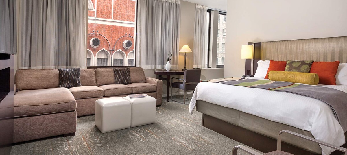 Relax in a stylish boutique room designed for comfort & convenience, featuring air conditioning, a coffee maker, and premium bathroom amenities. Perfect for couples or solo travelers, the room sleeps two & offers the option to connect with adjacent rooms for added flexibility. Enjoy modern touches like streaming entertainment, a radio alarm clock, and a pet-friendly atmosphere. With access to an on-site restaurant, fitness center, & digital key entry, your stay is as seamless as it is memorable.