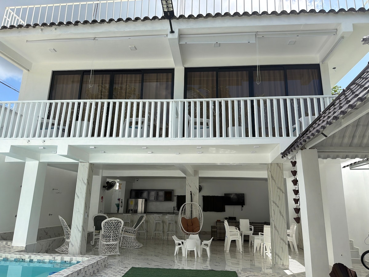 House is found in Cuidad Modelo. Quiet area in Tenares. House has a pool (non-heated). 4 bedrooms- Main room has 1 King size bed and private bathroom, 3 rooms with 1 Queen size bed each 3 full baths- 1 downstairs and 2 upstairs -main room plus one Living area, dining area, and kitchen (equipped with all appliances) 4 balconies and parking space for 2 cars Washer machine and generator for power outages