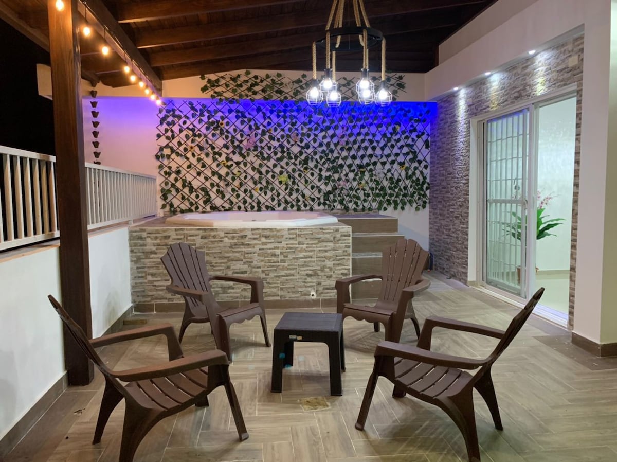 Este lugar es único tiene su propio estilo moderno cocina español, jacuzzi al aire libres ,y piscina común parqueo,vista a 2 montaña la cordillera central ,y la cordillera septentrional.