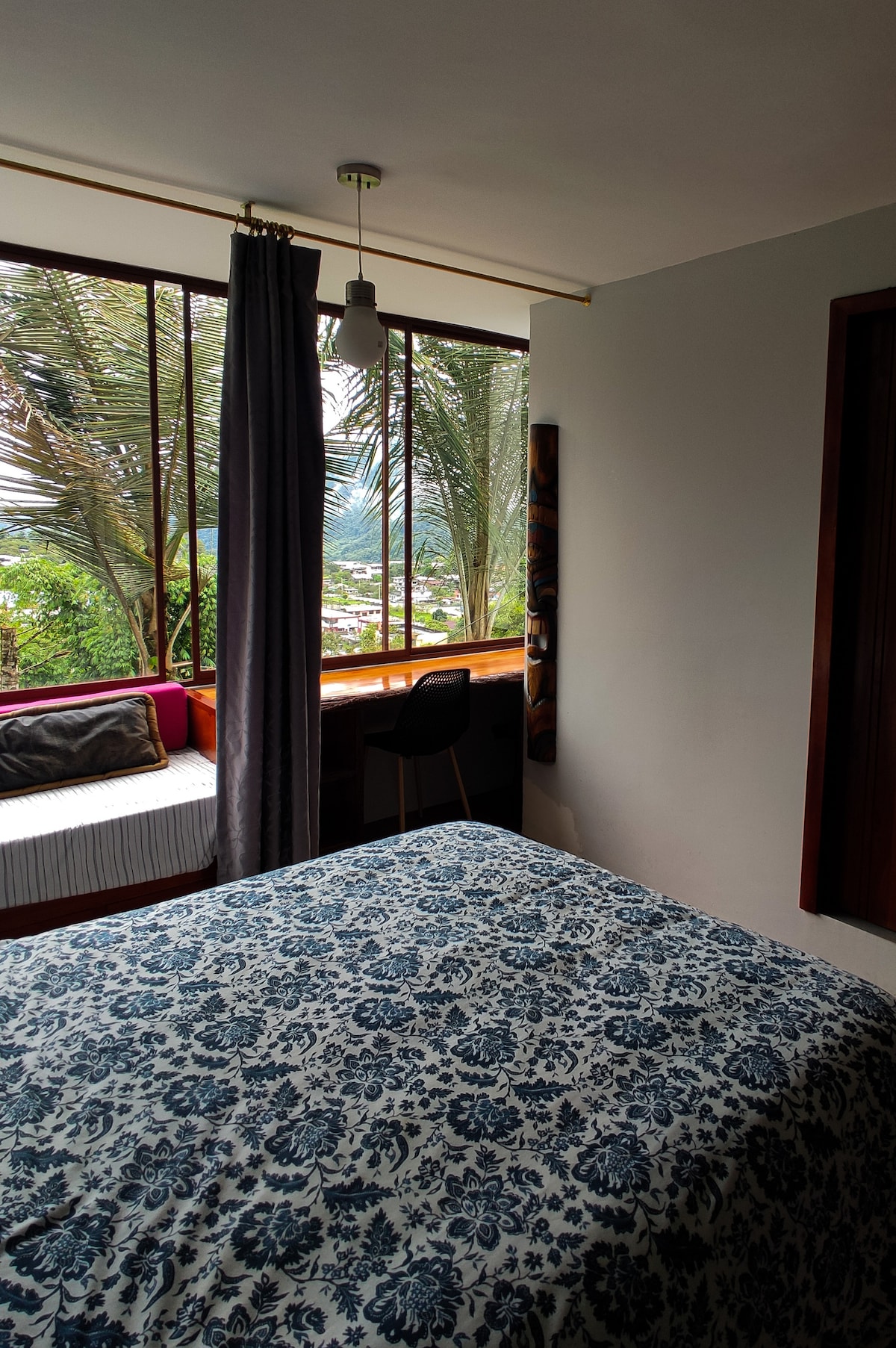 Mini suite con cocina, comedor y espacio para trabajar, ubicada en el tercer piso de la casa principal, con entrada independiente, estacionamiento gratuito, vista panorámica, lejos del ruido de la ciudad, excelente espacio para disfrutar de la naturaleza, si el clima lo permite se puede ver el volcán Reventador. La habitación cuenta con WiFi, agua caliente, baño independiente dentro de la habitación. Se puede usar el espacio para BBQ previa coordinación.