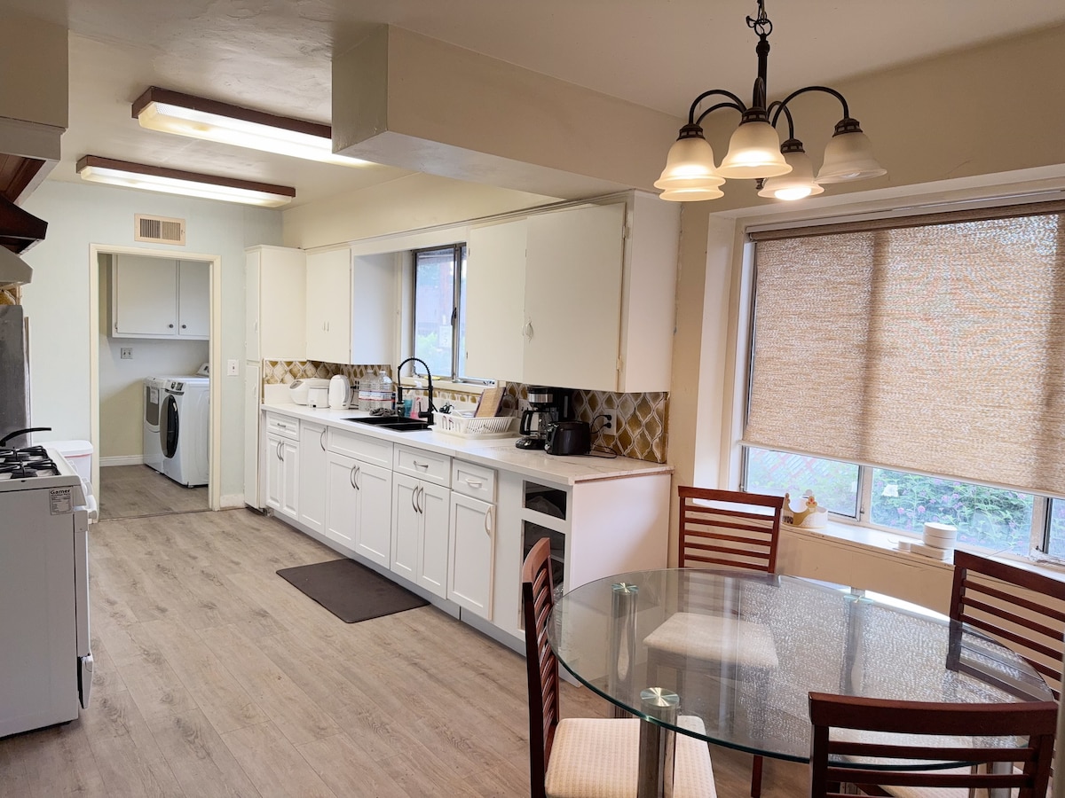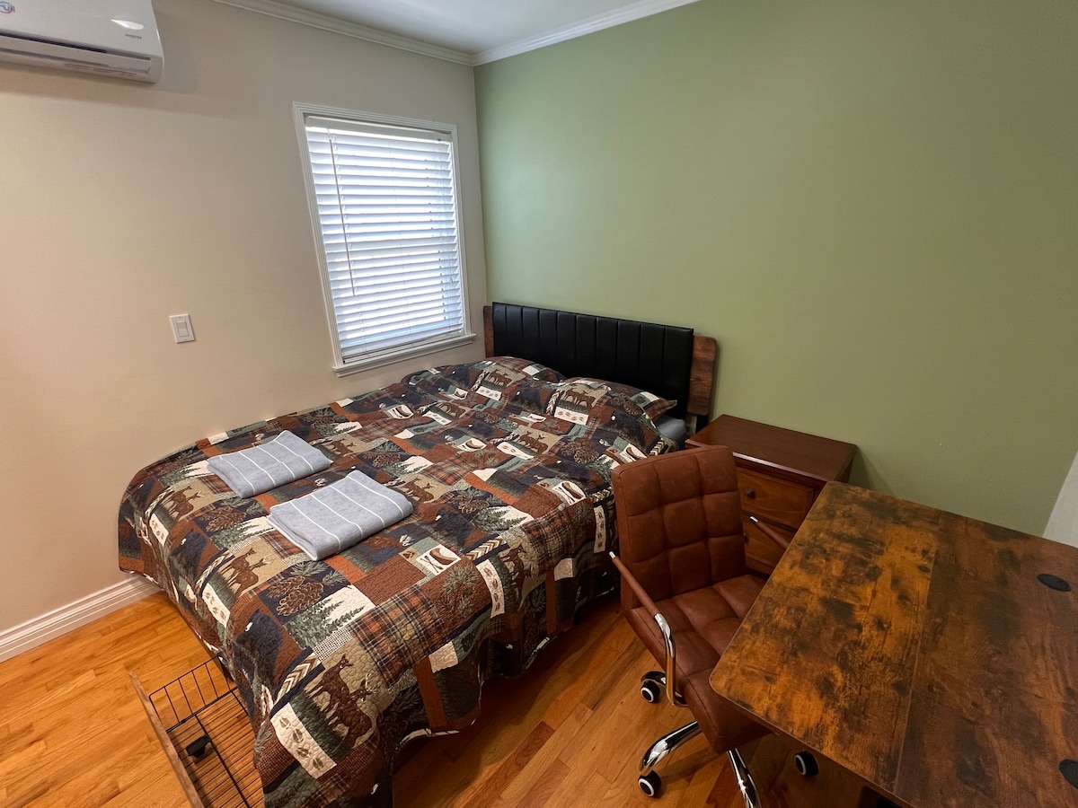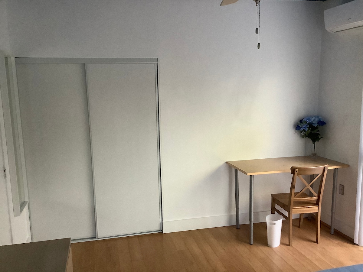 Quiet and cozy standalone guesthouse with private entrance and self check-in. No contact with other guests, no spaces are shared — everything is entirely for your private use. Features a queen-size bed ideal for couples, an additional sofa bed can be provided for the third guest to sleep on. A/C and heating, work desk, fan, and smoke detector. Enjoy a private kitchen for light cooking, a walk-in shower, and blackout curtains for restful sleep. Large windows provide plenty of natural light.