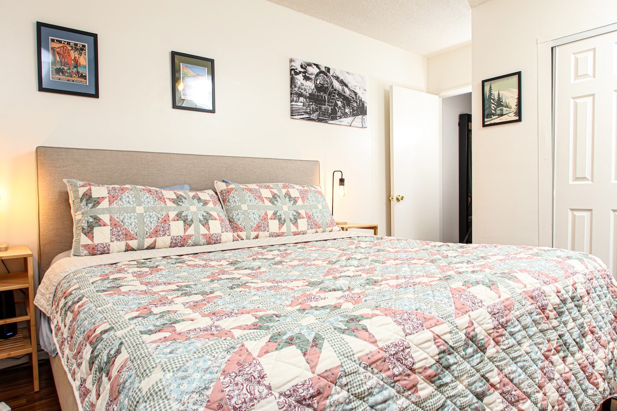 2 bedroom 2 bath unit that sleeps 4. Walk to 35 Restaurants, cafe, & bars walking distance to this home Comes with King size bed with bathroom en suite, Queen bed, Full size, couch sleeper, 3 Smart TVs, central A/C, fully stocked large kitchen- lots of storage, work desk, private washer & dryer, fast WiFi, Free garage parking, hard surface floors, area rugs, (Disney, Netflix, YouTube, Hulu channels ++)RICE COOKER IN THE KITCHEN :) .