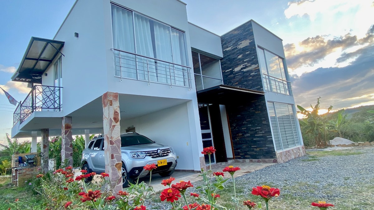 Luxurious countryside house with astonishing mountain view and good Internet Acces! La casa cuenta con una maravillosa vista de las montañas, es muy iluminada y soleada de día y fresca en las noches, está rodeada por fincas que se dedican principalmente al cultivo de café. Se pueden realizar caminatas a través de los caminos veredales y disfrutar de bellos paisajes y aire fresco. El acceso a la casa es mayormente por carretera pavimentada y aproximadamente 2 km de carretera con "placa huella".