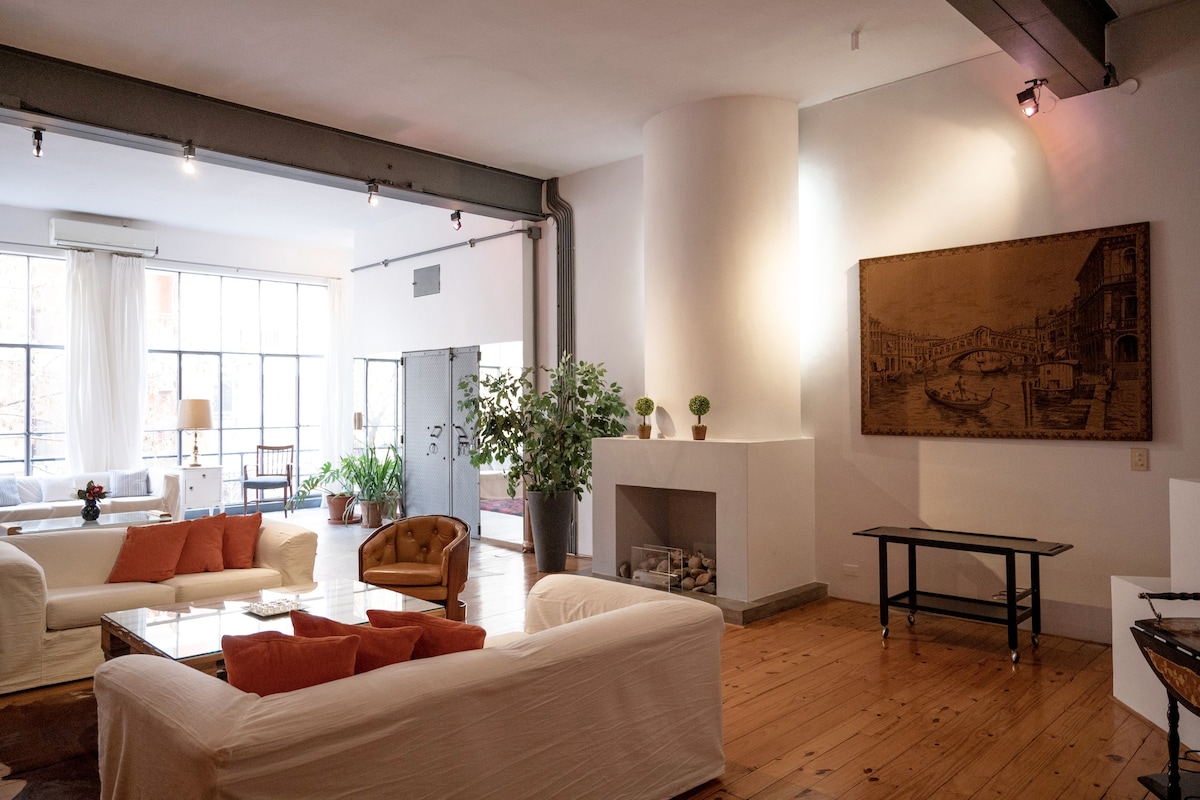Located in the historical Pasaje Santamarina, close to the heart of San Telmo, and reached through one flight of stairs, it has a living area with a fireplace and an integrated kitchen, 2 bedrooms (one in an open mezzanine, with a desk), an entertainment center with an LCD TV (with Chromecast, no cable), a bathroom (with shower box, no tub), and a walk-in closet. Features Wi-fi connection and a central air conditioning system. Very quiet and light-filled. Easy access to Buenos Aires attractions.