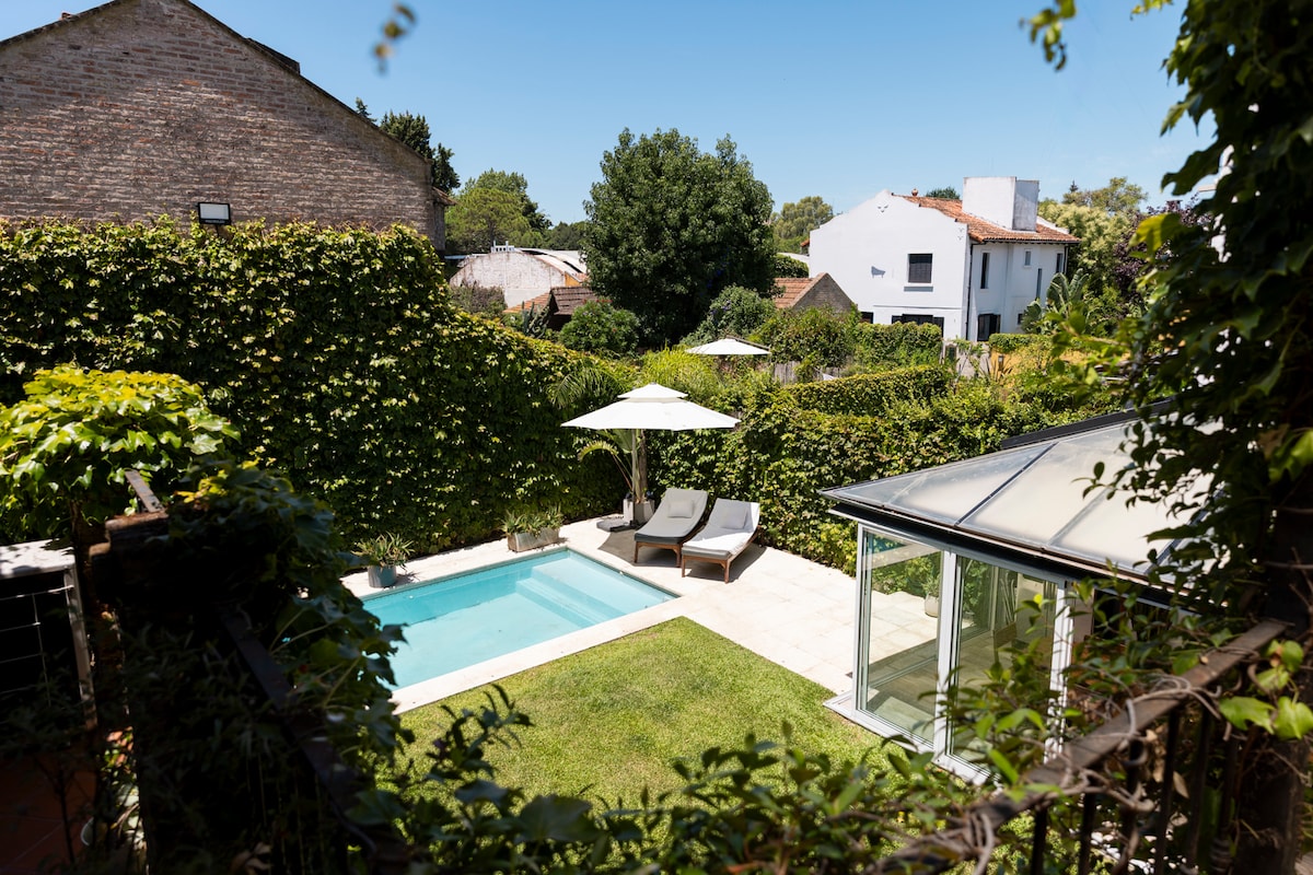 La casa se encuentra el bajo de San Isidro, frente al puerto, cerca de la reserva ecológica y a metros del río, lindo para andar en bicicleta, el barrio es muy tranquilo, en plena zona gastronómica. La casa es amplia y muy luminosa , el jardín es grande, los cuartos son comodos con grandes ventanales, la sensación de vivir aqui es como estar de vacaciones en plena ciudad.