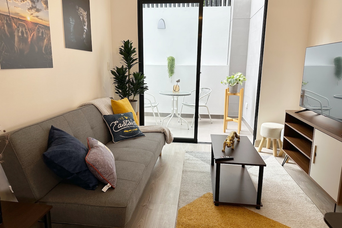 Departamento amplio y elegante en el corazón de Barranco. Ubicación privilegiada: A pasos de los principales puntos turísticos de Barranco y Miraflores, de los mejores restaurantes, bares y galerías de arte. Dormitorio principal: Cama king-size y gran walking closet. Espacio abierto y luminoso: Sala de estar y kitchenette con luz natural. Cochera privada: sujeta a disponibilidad Áreas comunes: Gimnasio, ambiente para reuniones y area de juego para niños. Estilo minimalista.