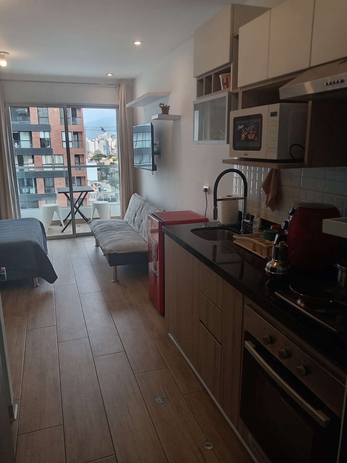 Cómodo y estilizado apartamento studio, idealmente ubicado en el límite entre Barranco y Miraflores, a solo unos pasos de los mejores restaurantes, vida nocturna y hermosas vistas del Océano Pacífico. El lugar perfecto para la mejor experiencia en Lima. La sofisticación de Miraflores y la originalidad de Barranco muy cerca de ti.