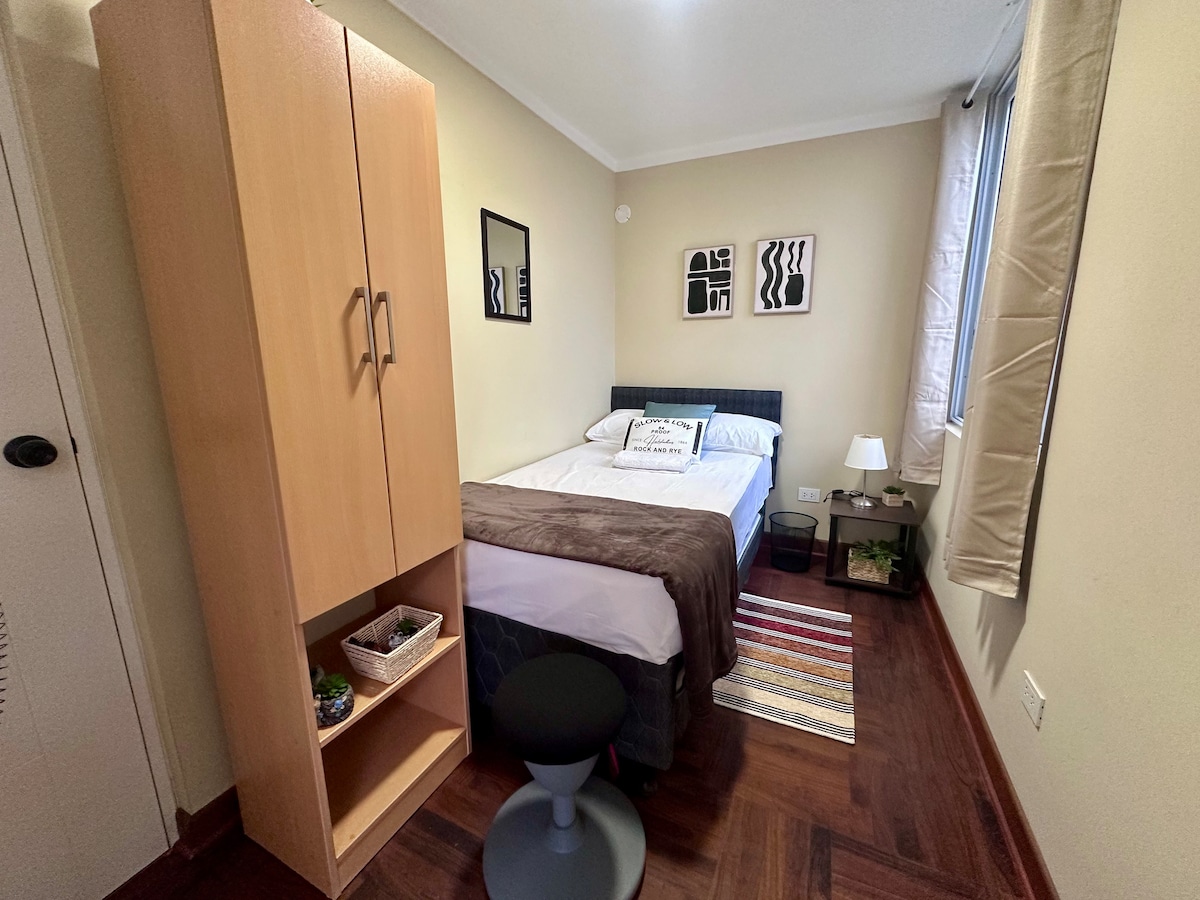 Se ofrece un confortable y acogedor ambiente independiente estilo "apart-hotel" con cama matrimonial, baño completo, hall y una cocina incluyendo refrigerador y microondas cuenta con TV/cable/wifi, pisos de madera, closet, sofá-cama, baños con terma eléctrica, escritorio y silla ademas de iluminación y niveles de sonido perfectos para un buen descanso. El ambiente comparte entrada y hall con la casa familiar.