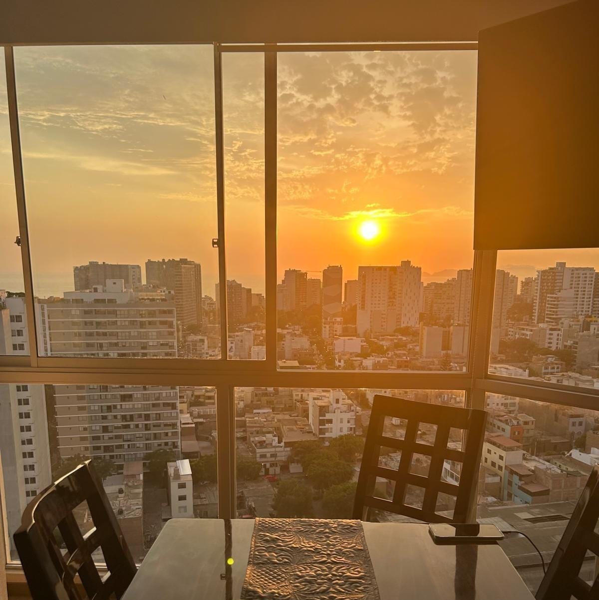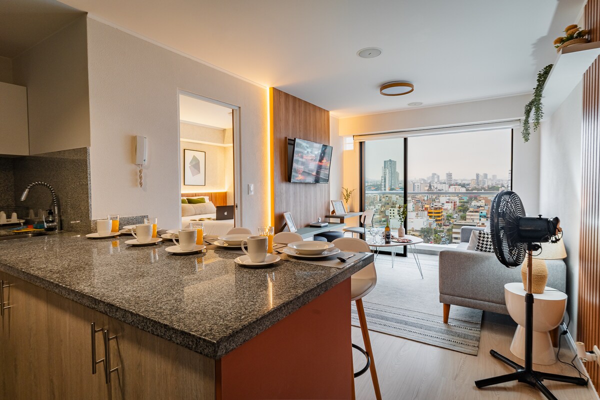 Departamento de estreno ubicado en excelente zona en Lima, Peru. Tendrás cerca restaurantes, centro comerciales, farmacias, supermercados, casinos, gimnasios, y oficinas corporativas y comerciales a menos de tres cuadras de distancia o cinco minutos a pie. Disfrutarás de un departamento totalmente nuevo y recién amoblado que hará tu visita en Lima placentera. El apartamento está diseñado con la finalidad de brindar al huésped un ambiente cálido y relajado, y disfrutar de una gran vista.