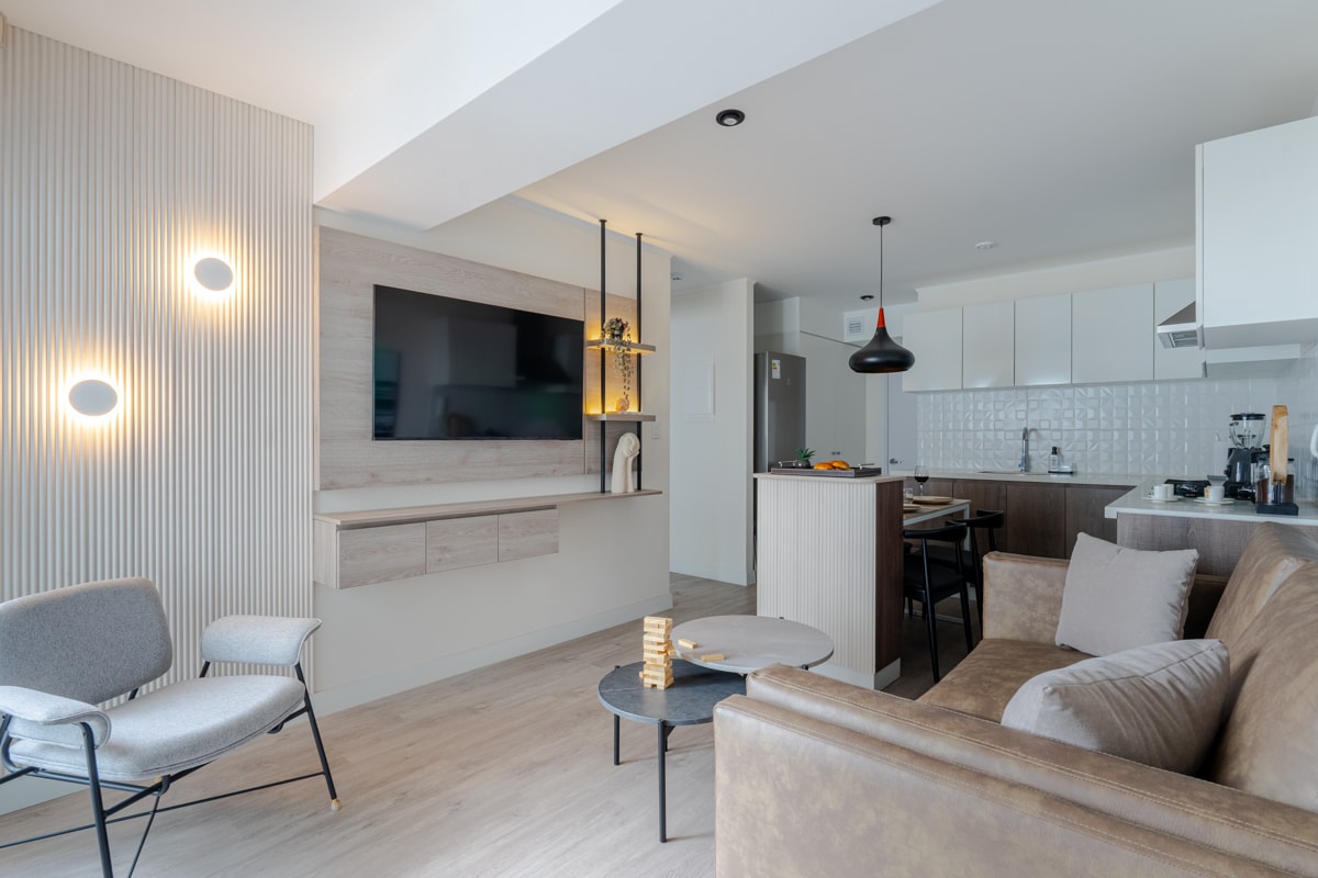 Este lujoso apartamento ofrece una estancia cómoda con una cocina totalmente equipada. Su decoración combina minimalismo y estilo cálido para crear un ambiente elegante y moderno. También tiene áreas comunes como piscina, gimnasio, parrilla, y sala de billar. Desde el rooftop, puedes disfrutar de impresionantes puestas de sol con vistas al mar. Rodeado de bares, restaurantes y tiendas de primera clase, en un barrio tranquilo y seguro.