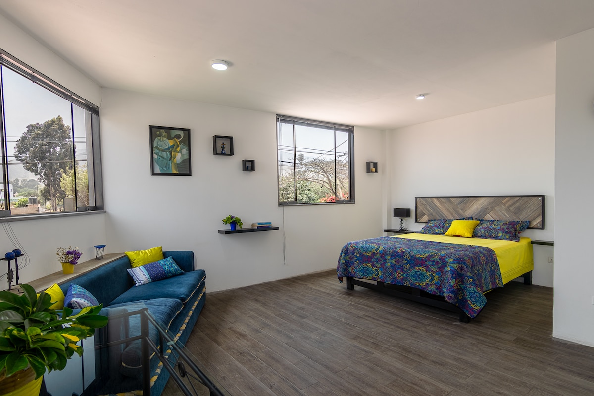 El Mini/departamento es confortable para 1 huésped, cama dos plazas/ matrimonial , amplio closet para estancias largas, un escritorio para trabajar y un televisor. Kitchenette con una cocina eléctrica de una hornilla, (comida light) porque el espacio es pequeño y cerrado, una mesa abatible con 2 sillas, hervidor eléctrico, un frio- bar, licuadora personal, microondas, un mini grill y menaje. Un baño amplio con ducha eléctrica. El lugar seguro. Entrada independ. 2do. piso.