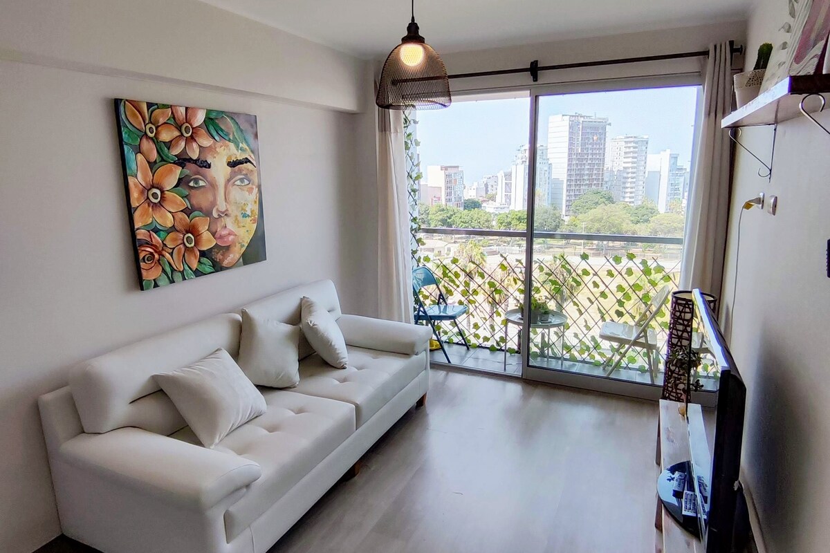 Super well located in MIraflores. Ideal for long stays and working nomads. Beautiful and quiet neighborhood. 1 block from boardwalk and best foodie street in Lima. Cozy, warm, modern, comfortable and very bright. Excellent Wifi! Fully equipped kitchen. Exterior sights and ocean view. Concierge 24hrs. A step away from bars, restaurants, malls, markets, cinemas, galleries and theaters. Beautiful parks with sea sights and outdoor activities. Walking distance from the coolest spots of Miraflores.