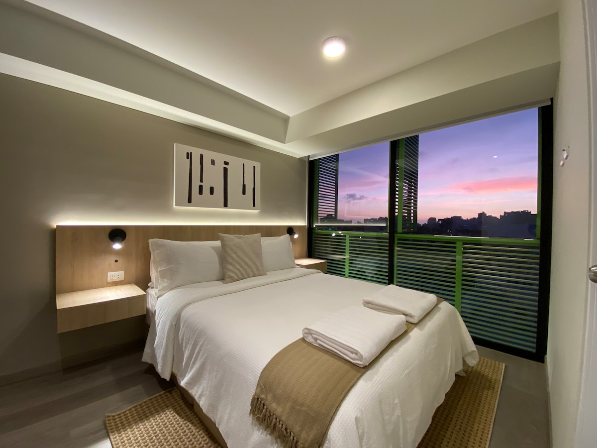 Este alojamiento tiene una ubicación estratégica ¡será muy fácil planear tu visita! Si lo tuyo es un viaje de negocios, turismo o placer, el apartamento, te ofrece la oportunidad de estar ubicado en el centro empresarial del distrito de San Isidro. Si lo tuyo es una velada romántica, el ambiente cuenta con ventanas de piso a techo con una vista espectacular y sus cortinas Roller Black Out le dará el toque de exclusividad que estás buscando. 60m2 bien distribuidos.