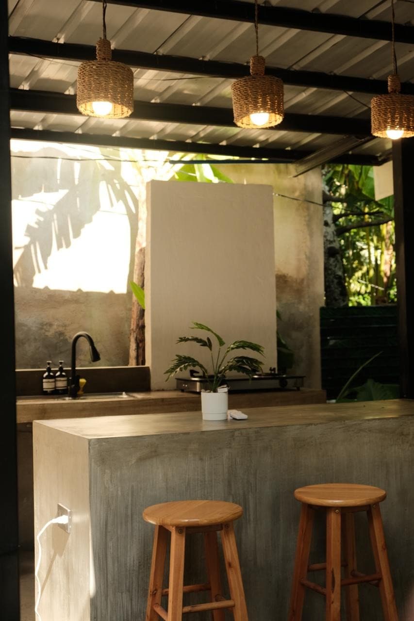 A cozy and homey space just 1 minute from the beach. This house includes: – Small kitchenette (rice cooker, kettle, fridge, single electric stovetop) – Private bathroom with hot water – Window-type aircon + electric fan – Rechargeable bedside lamps – A small speaker with a mic – A cozy bed (190x120 cm – best for solo travelers or close couples) – Surrounded by green plants and good vibes We live nearby and are happy to help with anything. Come as you are and enjoy island Life.