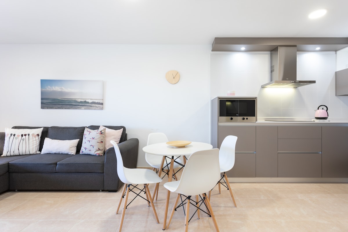 La sala de estar y cocina están en un espacio abierto, con un dormitorio y un baño. El apartamento está equipado con wifi, TV, microondas, horno, cafetera Nespreso, plancha, secador,plancha de pelo, toallas y sábanas. Tiene piscina, plaza garaje y ascensor. Esta ubicado a 5 minutos del centro, donde está la zona de bares, copas, restaurantes, supermercado, tiendas, farmacia. El apartamento está a 100m de la renombrada playa del Cabezo, cada año se celebra el campeonato del mundo de windsurf.