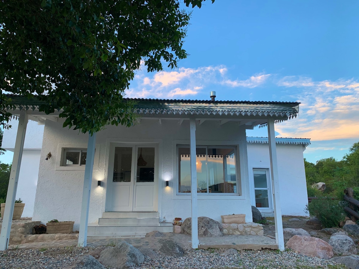 Cabaña al pie de las sierras con bajada propia al arroyo. Inmerso en el monte nativo rodeado de naturaleza. En el verano su mini piscina con vista a los cerros, su galería con asador y su gran jardín serán tu refugio. La salamandra te dará calor en invierno mientras disfrutas de la vista a los cerros nevados . La casita está pensada para que la privacidad sea lo más importante.