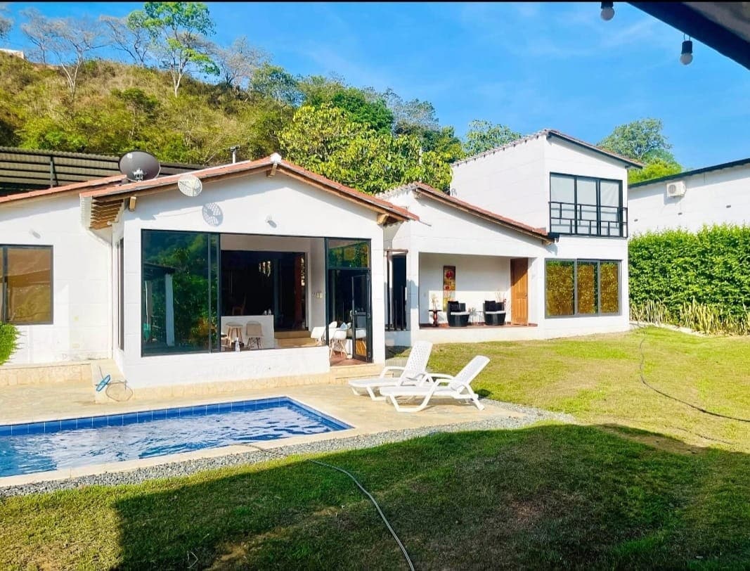 Esta hermosa casa, ubicada a 45 minutos de Medellín, es totalmente privada e ideal para familias que buscan disfrutar un fin de semana. Tiene capacidad máxima para 30 adultos (o 35 con niños) y cuenta con 4 habitaciones, 4 baños, áreas de juegos para NIÑOS y ADOLESCENTES, zona verde, piscina, kiosko, corredor, sala comedor y cocina. El valor publicado aplica para acomodar hasta 2 personas; desde la tercera persona, se adiciona un costo extra por noche persona hasta alcanzar la capacidad máxima.